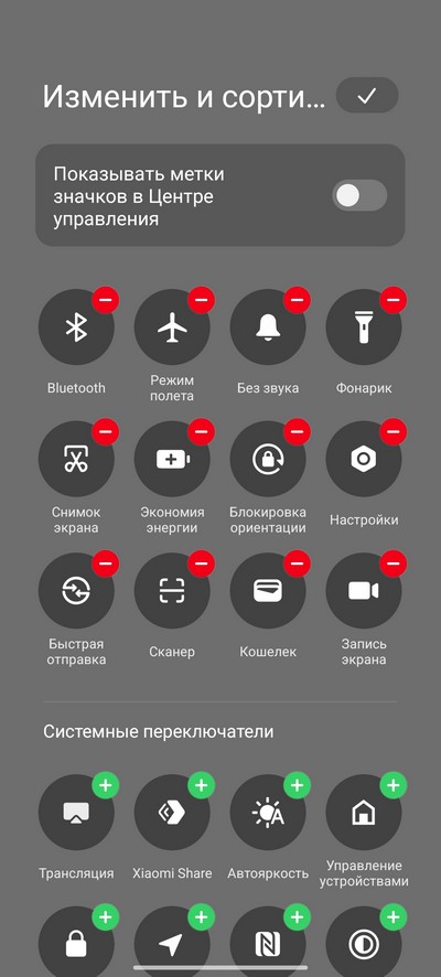 Область быстрых переключателей и их настройка.