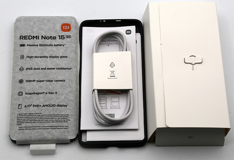 Замечу, что у Xiaomi есть также модель Redmi Note 15 4G. У него нет защиты, попроще платформа, нет сверхширика, нет стабилизации видео, аккумулятор старого типа (у 5G аккумулятор - кремний-углеродный), но у него больше емкость - 6000 мАч против 5520 мАч, также у него медленнее зарядка. Он стоит дешевле на 80 евро, но меня эта модель не заинтересовала: на мой взгляд, по соотношению цена-качество из 15-й серии самая интересная модель - именно Redmi Note 15 5G. Ну и давайте в данном обзоре с этой моделью и познакомимся.