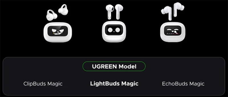 В серии наушников Magic с сенсорным экраном кейса у UGREEEN три модели: каффы ClipBuds Magic (наушники открытого типа), данные наушники-вкладыши LightBuds Magic и внутриканальные EchoBuds Magic.