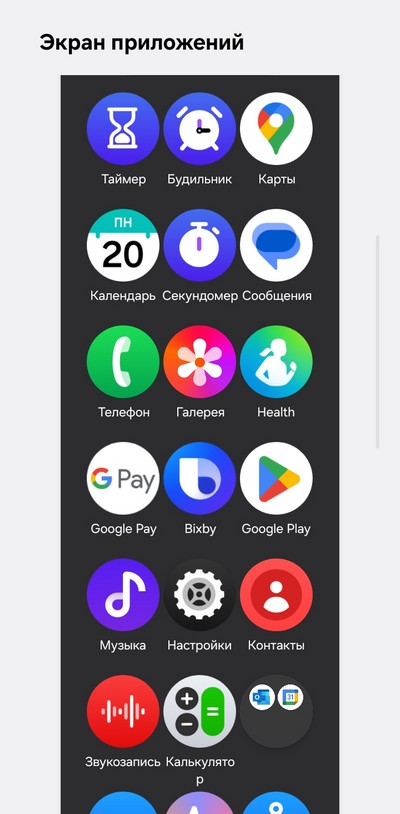 Настройка экрана приложений - там можно изменять порядок пиктограмм, также можно менять вид экрана приложений. Карточки - это виджеты приложений, которые появляются справа от циферблата при прокрутке. Вы сами определяете, какие виджеты вы там хотите видеть.