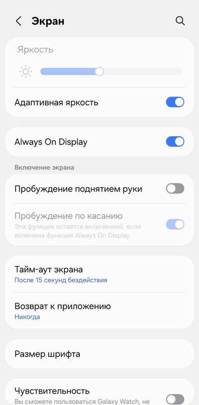Точно так же, как и у Watch7, режим AOD зависит от конкретного циферблата, и есть циферблаты, у которых AOD от включенного циферблата отличается только малозаметным понижением яркости. На фото ниже - это уже AOD, сравните его с дисплеем на фото выше, где часы включены.