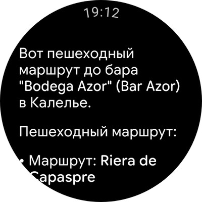 Также его, например, можно попросить построить маршрут куда-нибудь - он при этом выдает маршрут и предлагает вызвать карты Гугла с проложенным маршрутом.