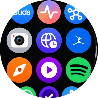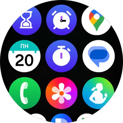 От циферблата свайп вверх - установленные приложения, коих довольно много. Также вы можете загружать любые приложения для часов из Google Play. У некоторых приложений могут быть различные скины - например, у секундомера. Также какие-то приложения могут выводить несколько экранов с информацией.