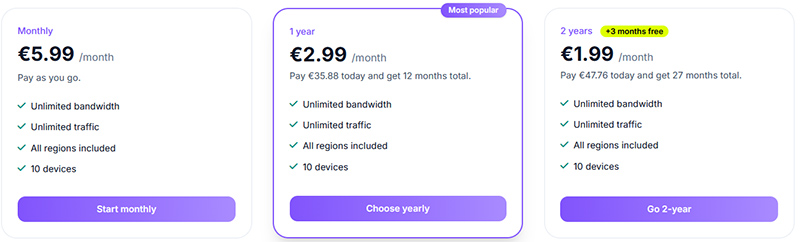 Сервис платный (хорошие VPN бесплатными не бывают, инфраструктуру нужно содержать), там есть несколько тарифных планов (помесячный, годовой, двухгодичный), однако новым пользователям дается возможность попробовать все возможности сервиса на полной скорости в течение 7 дней, при этом не требуется вводить данные банковской карты.
