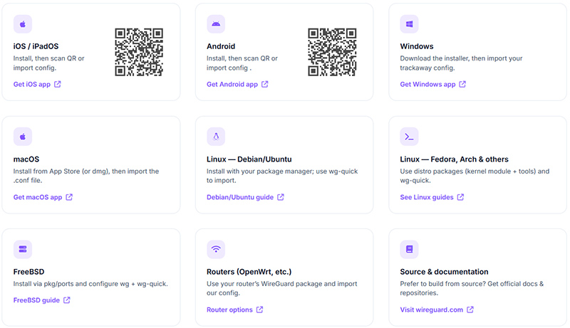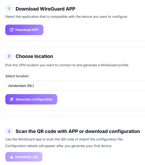 У VPN нет отдельного приложения, он подключается через приложение с открытым кодом WireGuard, доступное практически для всех платформ. Подключение туннеля не вызовет проблем даже у начинающих пользователей: нужно или отсканировать QR-код из приложения, или загрузить сгенерированный zip-файл в приложение на ПК.