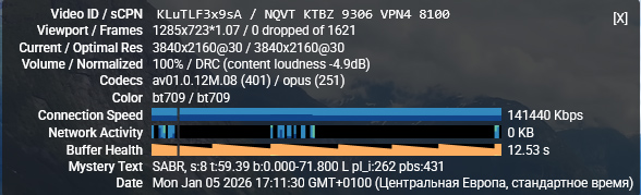 Тот же ролик через европейский сервер hidemy.name. И вот тут уже беда: 4K не идет категорически: постоянно зависает и пытается подгрузить нужный кусок, периодически YouTube сам сбрасывает качество с 4K на 720p - так хоть он более или менее показывается.