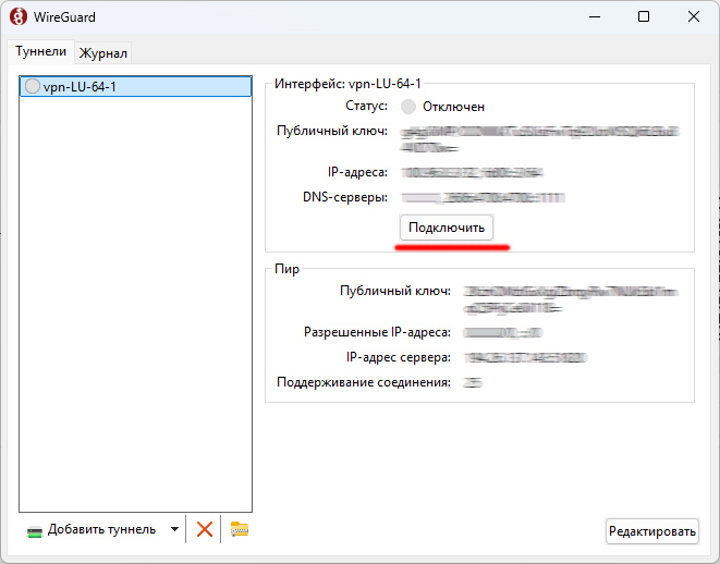 После этого туннель будет создан, и вам останется только нажать кнопку "Подключить".