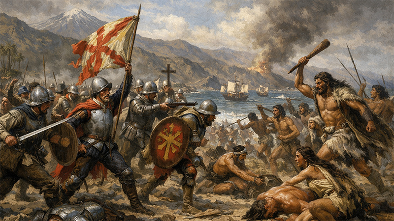 Картина художника ChatGPT "Завоевание испанскими конкистадорами Тенерифе"