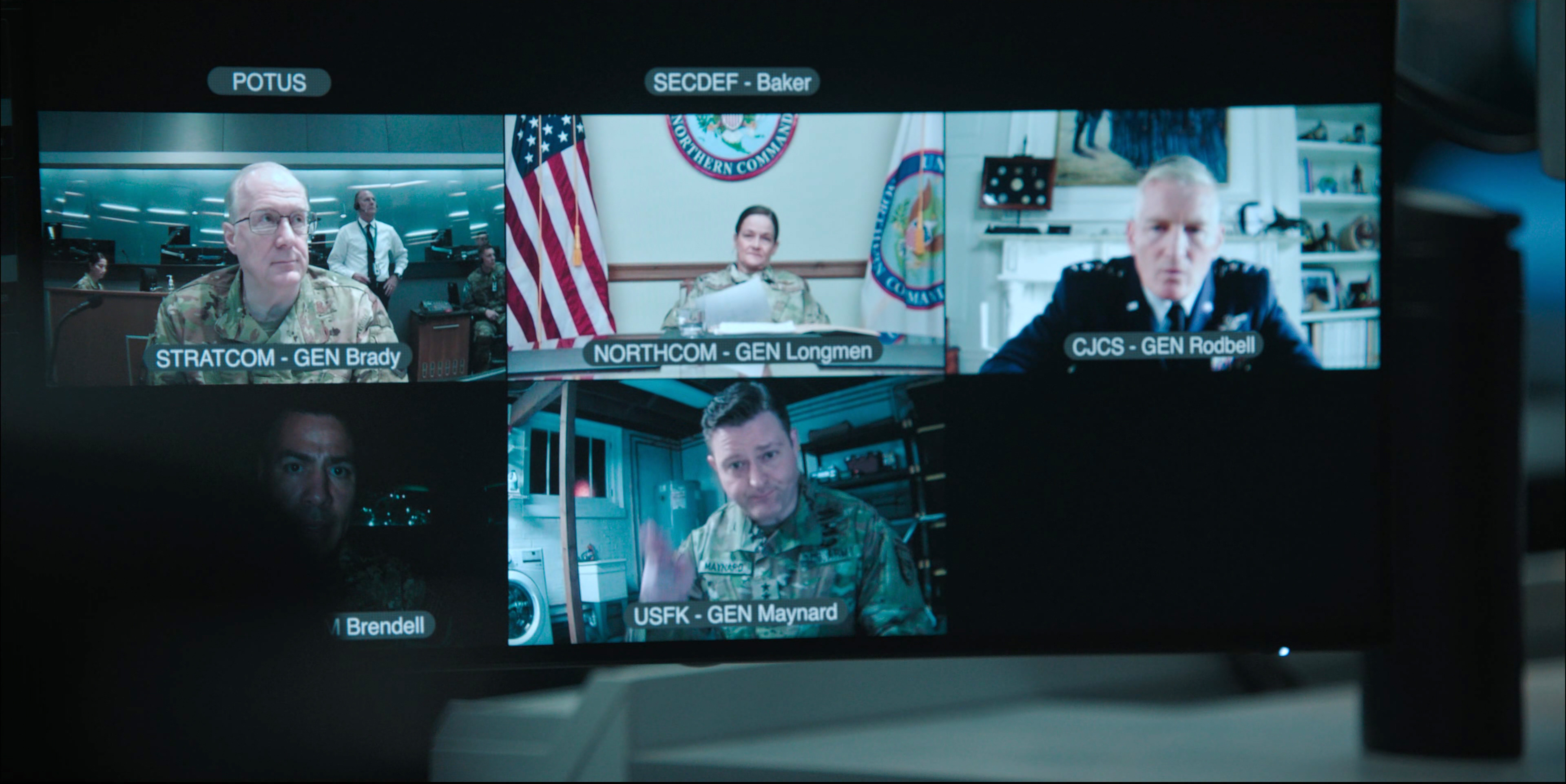 Здесь мы видим эти двадцать минут с точек зрения Оливии Уолкер и Дэвида Гонсалеса, затем нам показывают Стратегическое командование США, где генерал Энотни Брэди (Трейси Леттс) планирует координированную атаку на врагов США - разумеется, это КНР, КНДР и РФ, - если не будет выяснено, кто именно запустил ракету; в это же время в Белом доме заместитель советника по национальной безопасности (сам советник временно вышел из строя) Джейк Берингтон (Габриэль Бассо) пытается найти более мирное решение, ну и также нам покажут подробности того, как на это все реагировал Министр обороны США Рид Бэйкер (Джаред Харрис), и Президент США, чье имя в фильме ни разу не называется - в селекторном совещании он фигурирует под аббревиатурой POTUS (President of the United States), и в совещании по Zoom он присутствует только в виде голоса без видео.