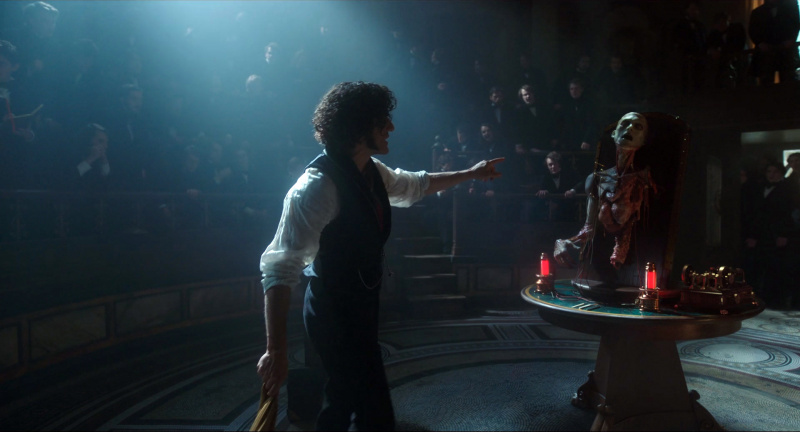 И там с точки зрения грима и постановки было интересное решение: первоначально Существо выглядит пугающе, его лицо и тело сшито из разных кусков, оно двигается как какой-то кадавр (я читал, что Элорди для движений Существа использовал элементы японского танца буто), но позже, когда Существо проходит определенный путь развития, на его лице постепенно проявляются человеческие черты.