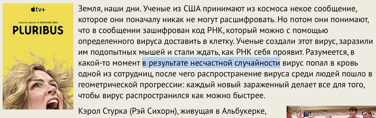 "Странный" - вызывающий недоумение, удивление своей необычностью. Т.е. отклонение от большинства. Так что чисто технически Алекс прав, это именно что странная претензия. И не лично для него, а вообще. Что, впрочем, не отменяет ее права на существование. Кому-то из нас без сопереживания и просмотр не мил. Я сам один из, с оговорками (хотя Наследников смотрел с удовольствием). И Pluribus тоже, хотя тут к героине некоторое сопереживание имеет место быть. Точно отмеренное сценаристами, мне кажется.