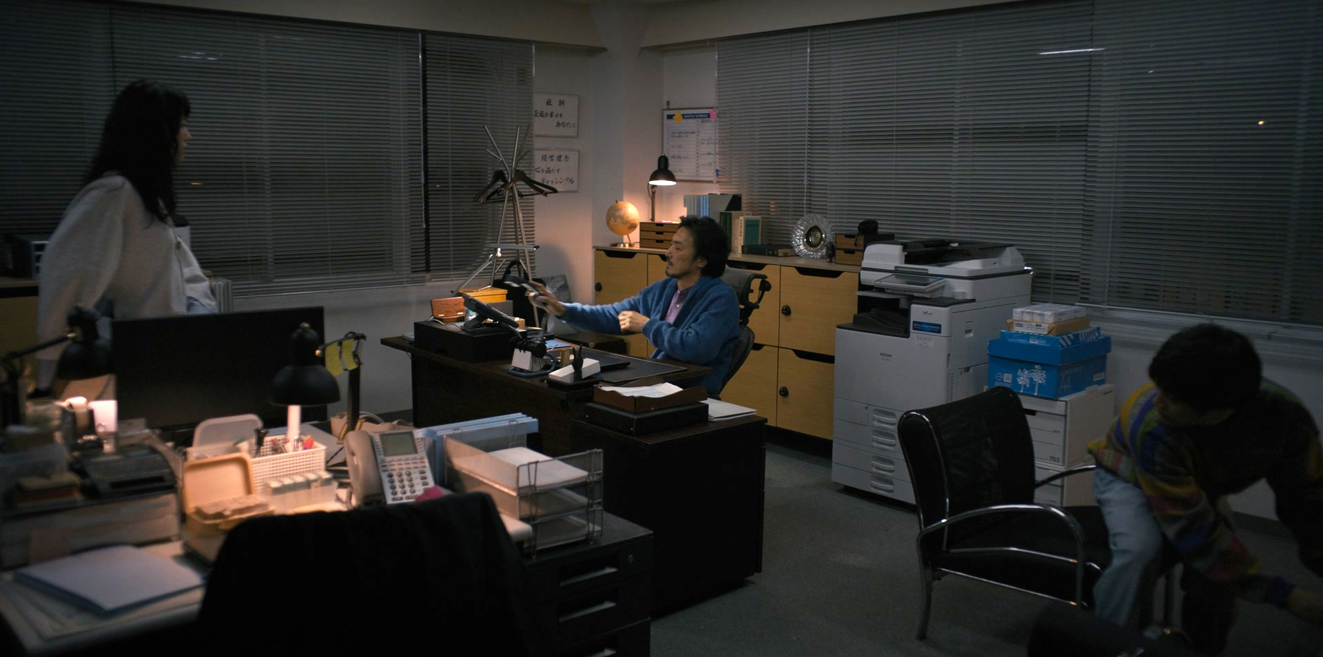 С чего главный критик считает, что Синдзи - единственный интересный персонаж фильма, мне тоже непонятно. Синдзи как раз персонаж достаточно примитивный. Начальник конторы, работающий по принципы "я - начальник, ты - дурак, так что заткнись и делай, что говорят", которому в конце концов Айко выдала всю правду-матку в лицо и уволилась, а Синдзи вместо того чтобы набрать новый персонал, покаялся, посыпал голову пеплом и заявил, что "ему нужно было это услышать", после чего сказал, что они "будут работать по-новому". Вот в этом-то что интересного? Впрочем, замечу, что актер Такэхиро Хира, сыгравший Синдзи, он интересный и харизматичный.